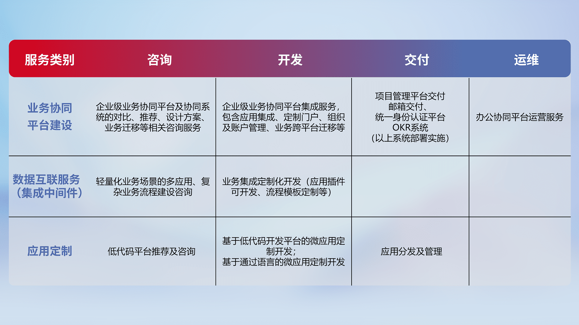 针对钉钉、、、、企微、、、、IDaas等平台级产品提供产品的规划、、、方案、、、、交付、、、定制化开发等服务,,,实现如统一协同办公、、、、智能客户服务、、、混合会议管理、、智能数据查询、、、、等业务场景,,实现数字化转型。。。。
